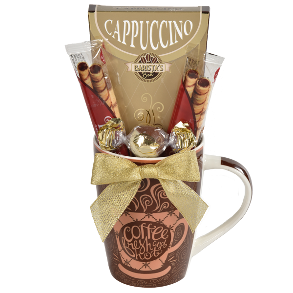 Cappuccino, Hazelnut Chocolate Truffle, Chocolate/Hazelnut Cream Filled Wafers, Coffee Mug.