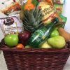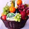A variety of fresh seasonal fruits, cookies, Perrier water, milk chocolates, candies, almonds and oatmeal cookies.
