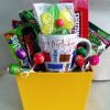 Gift box loaded with sweet and salty treats. A variety of hard candies, candy bars, sour candy, chocolates, Birthday Mug, pretzels and chips.