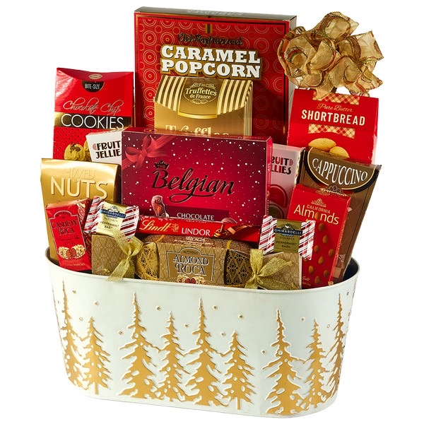 Oval Metal Christmas themed basket with seasonal treats; Lindt Lindor Milk Choc Stick 38g, Brown & Haley Cashew Roca 11g, Brown & Haley Almond Roca 33g, Ghirardelli Choc Peppermint 11g (2 pcs), Truffettes de France Truffles 90g, Comfort Collection Caramel Popcorn 160g, Sonia’s Favourite Cookies 57g, Aunt Gloria’s Shortbreads 57g, Snacktales Premium Mixed Nuts 40g, The Belgian Chocolates 250g, Barista’s Best Cappuccino 28g, Snacktales Almonds 18g, Pizzaz Fruit Jellies 42g (2 pcs).
