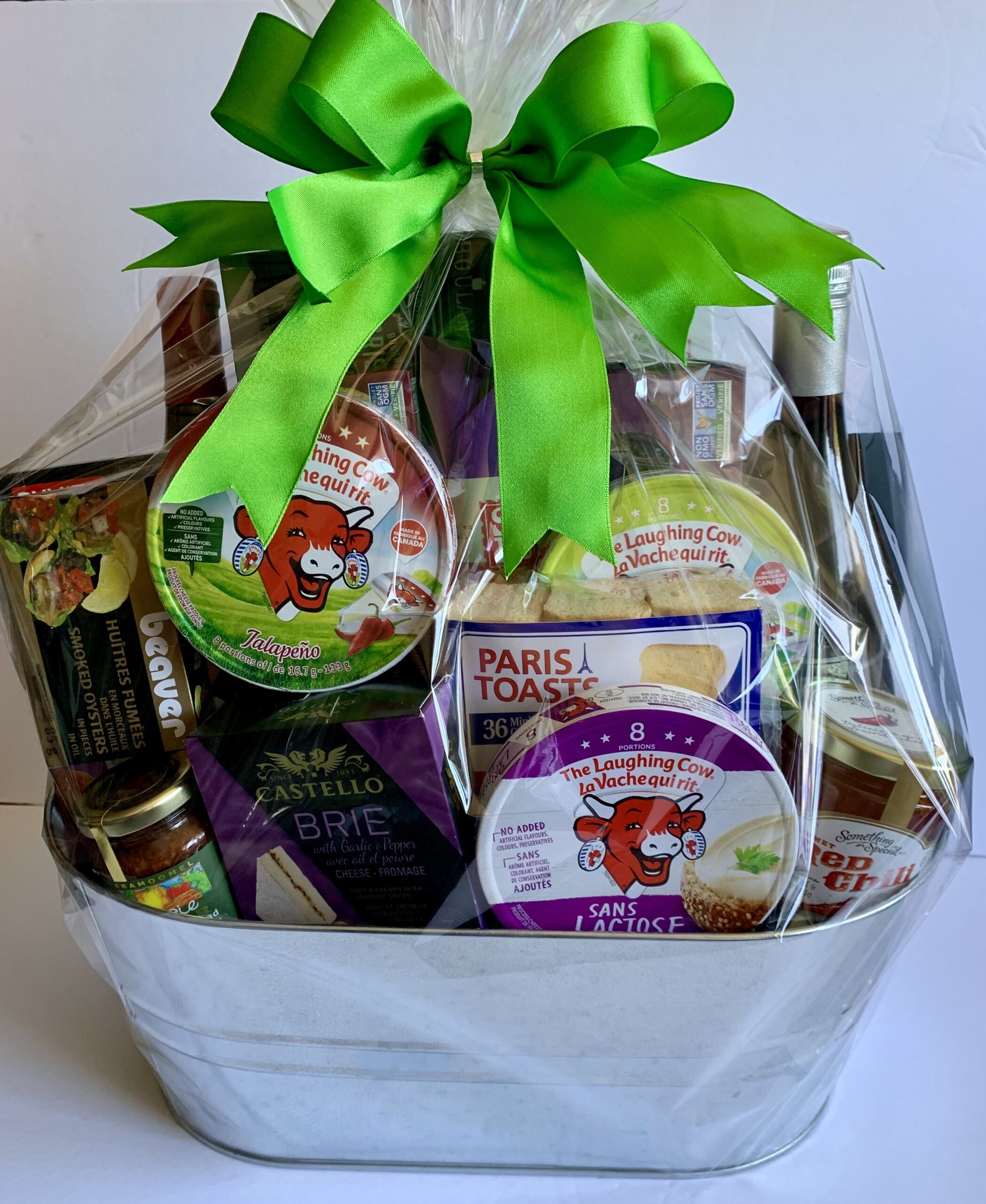 Flatbread, Pretzels, Sesame Breadsticks, Garlic Cheese, Brie Cheese, Jalapeño Cheese, Cheddar Cheese, Red wine, White wine, Hot Red Pepper Jelly, Antipasto, Smoked Oysters, Crackers, Paris Toast, Chocolates, Hickory Roasted Almond.